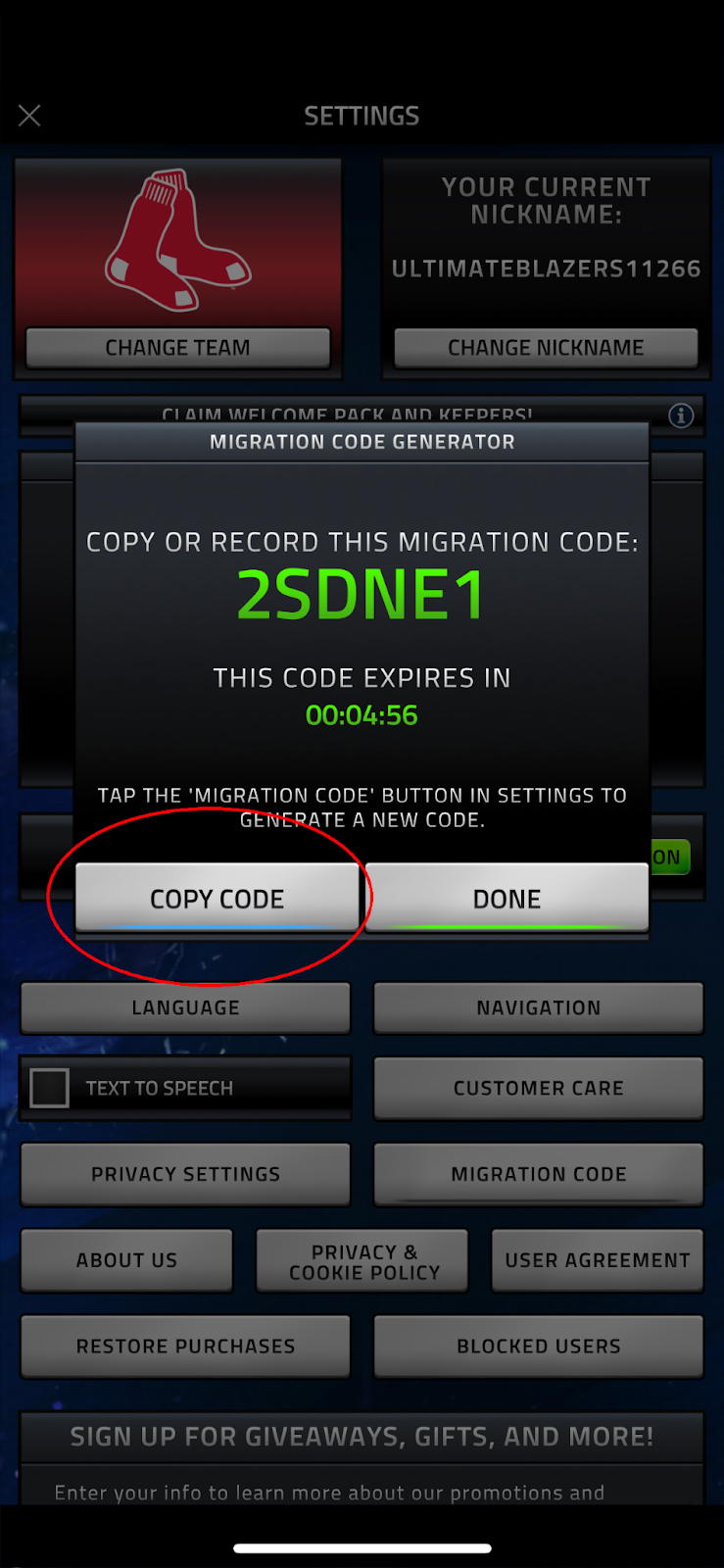 TSB22 설정 메뉴에서 "마이그레이션 코드" 버튼을 찾아 생성되는 코드를 복사하세요. 이 코드는 5분 동안 유효합니다.